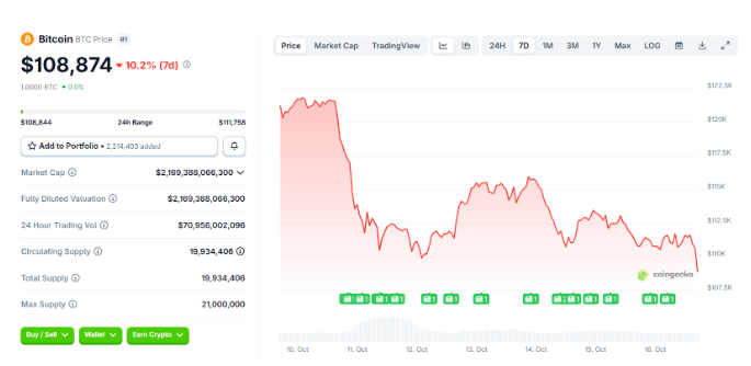 Bitcoin trades around $108,874, 2% in the past day. The downturn follows an escalating trade tension between the US and China. BTC has shed nearly $5,000 in the past month, with trading volume down over 20%.